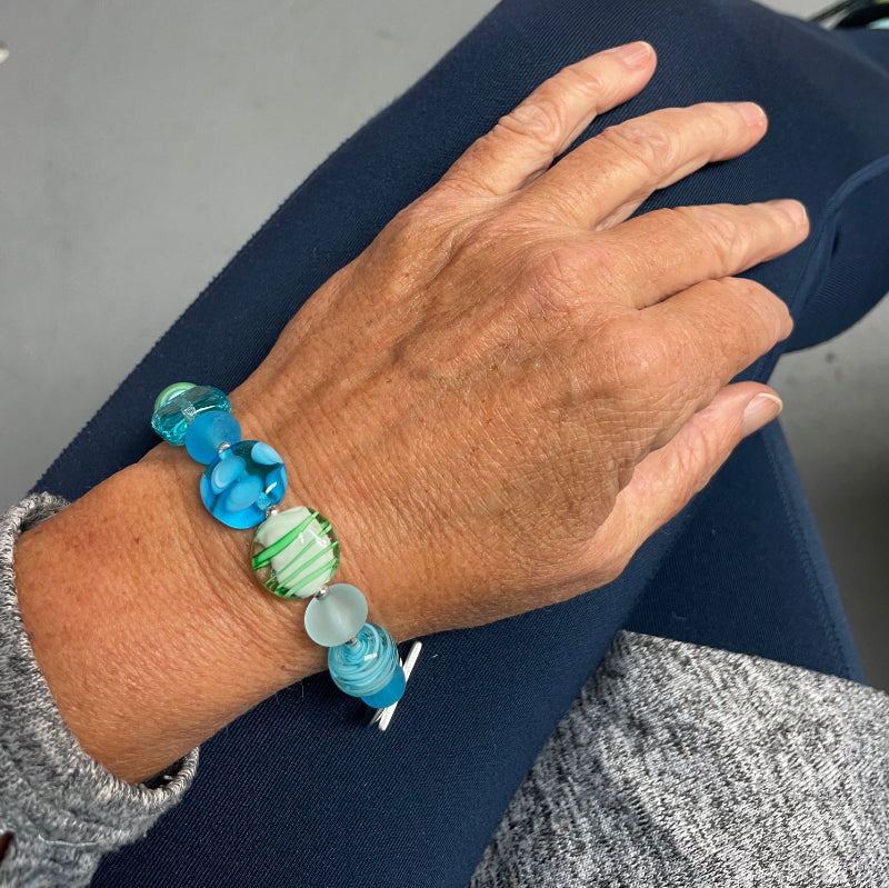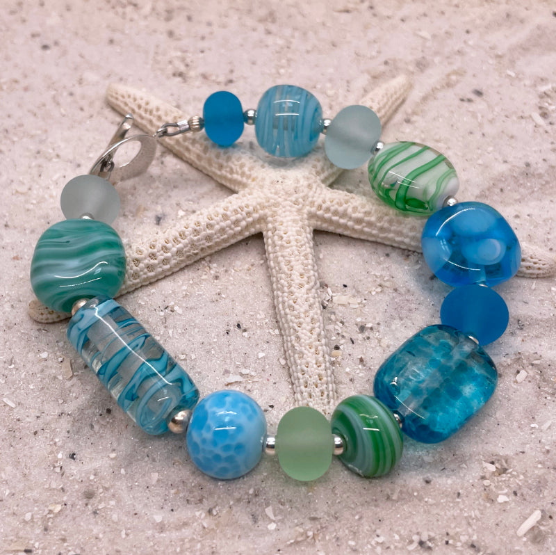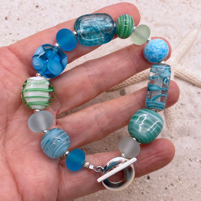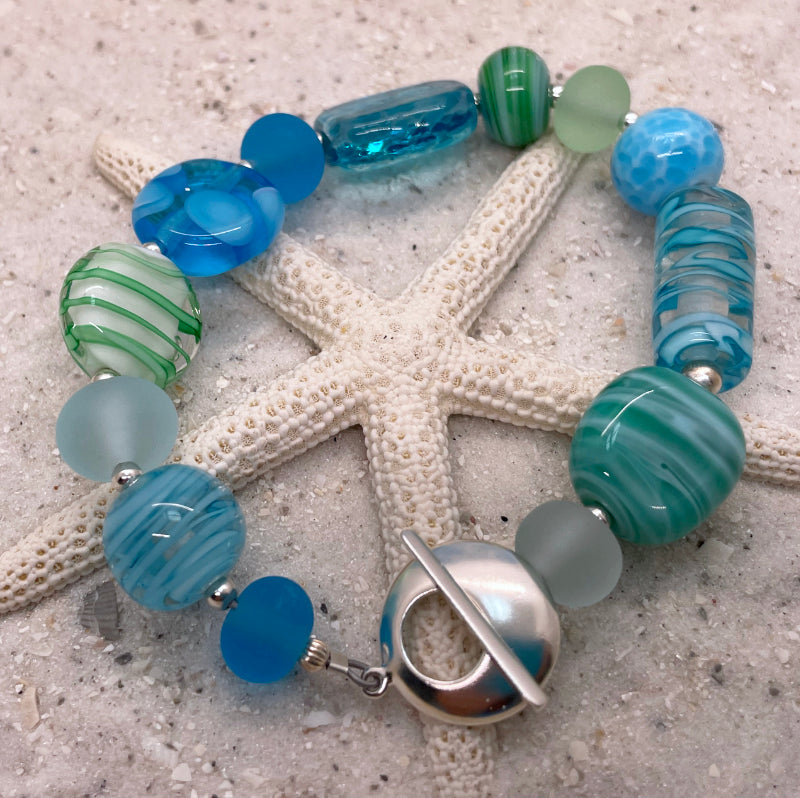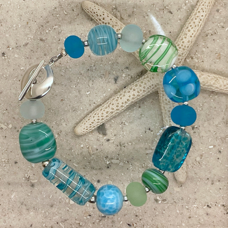 My hands made this dreamshore bracelet. The lampwork beads are made by me! The beads vary in size from 11mm x 8mm to 20mm x 11mm. They are connected with sterling silver findings and the bracelet is finished with a beautifully elegant sterling silver toggle clasp. The total length of the bracelet is 8 1/2" and this fits a medium/large size wrist.