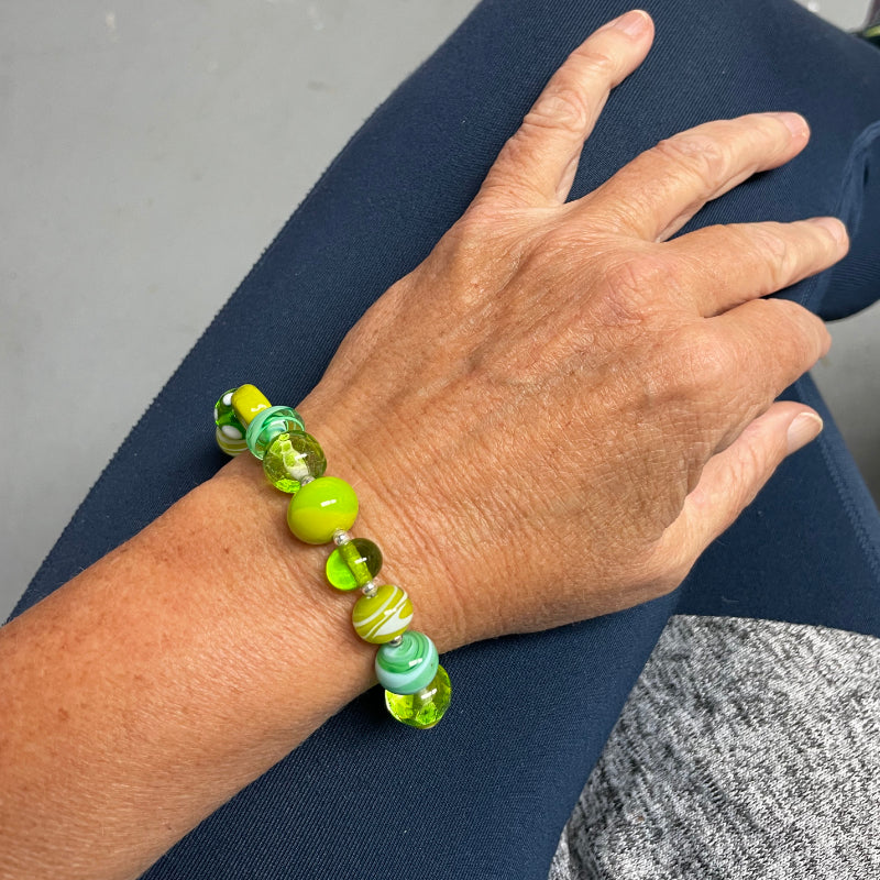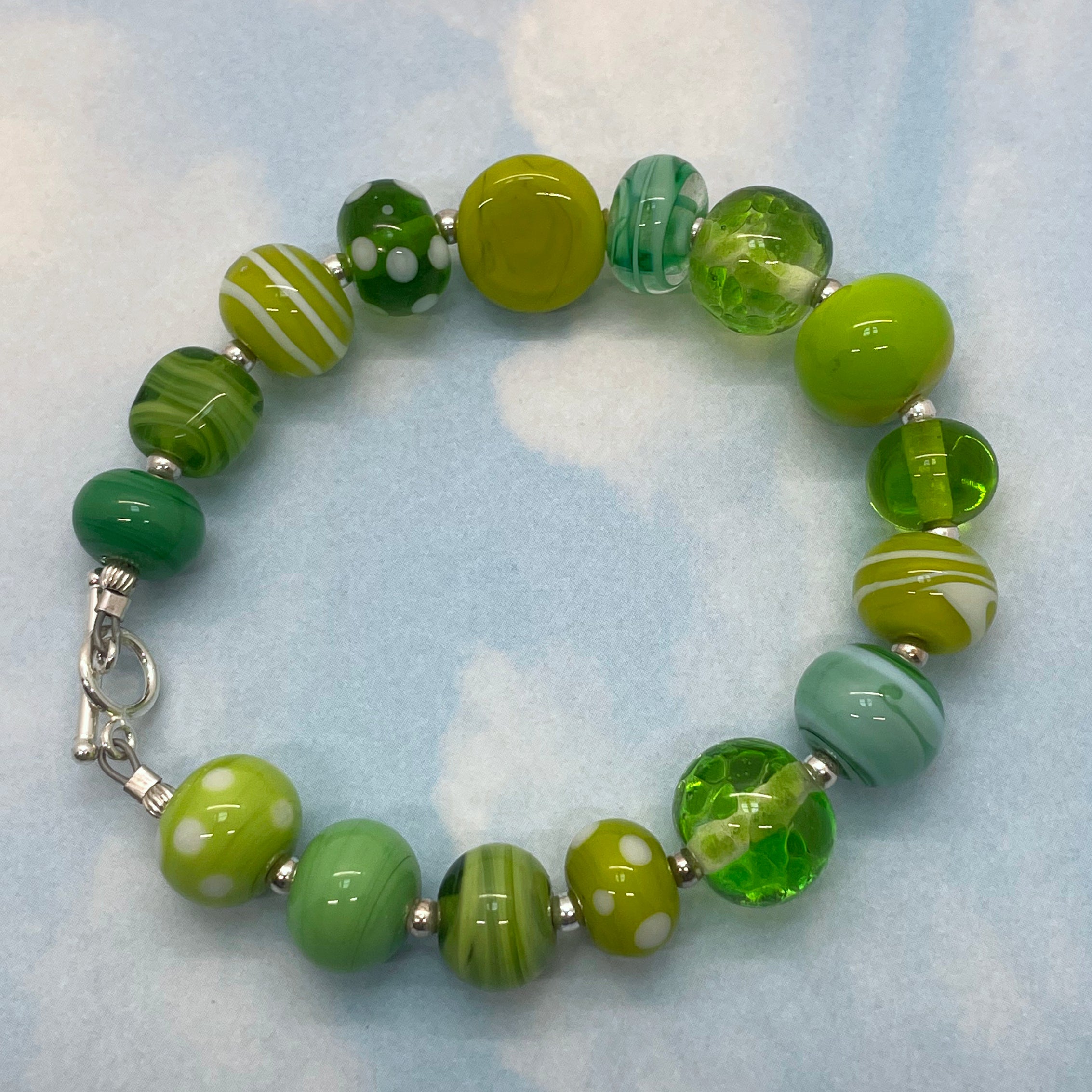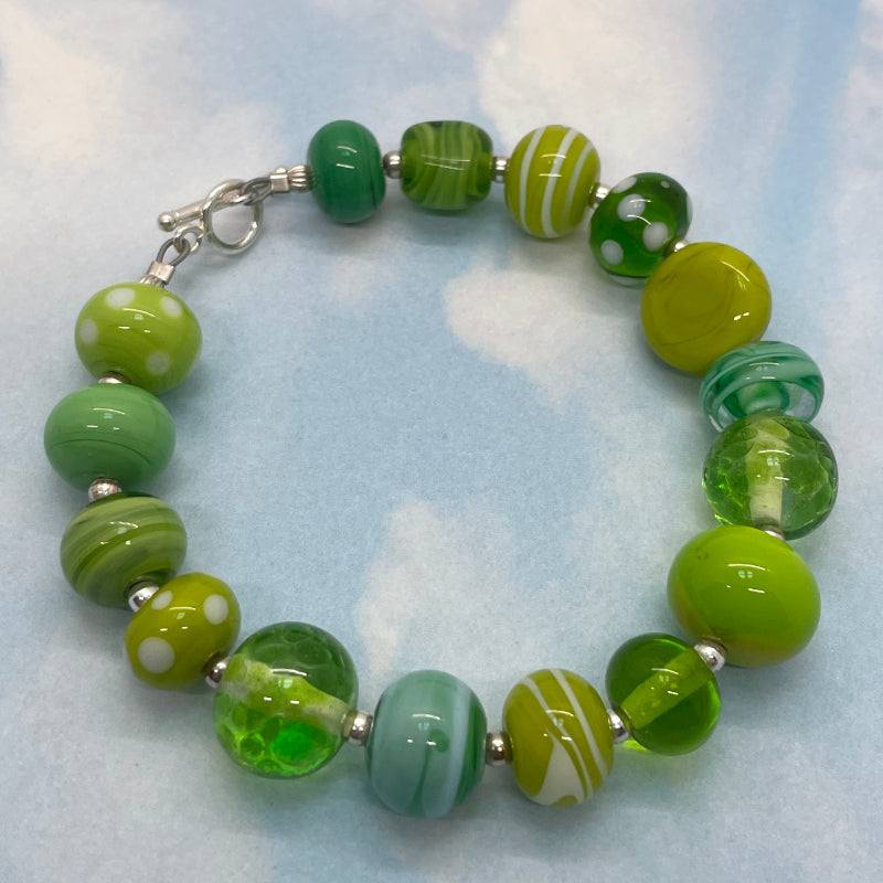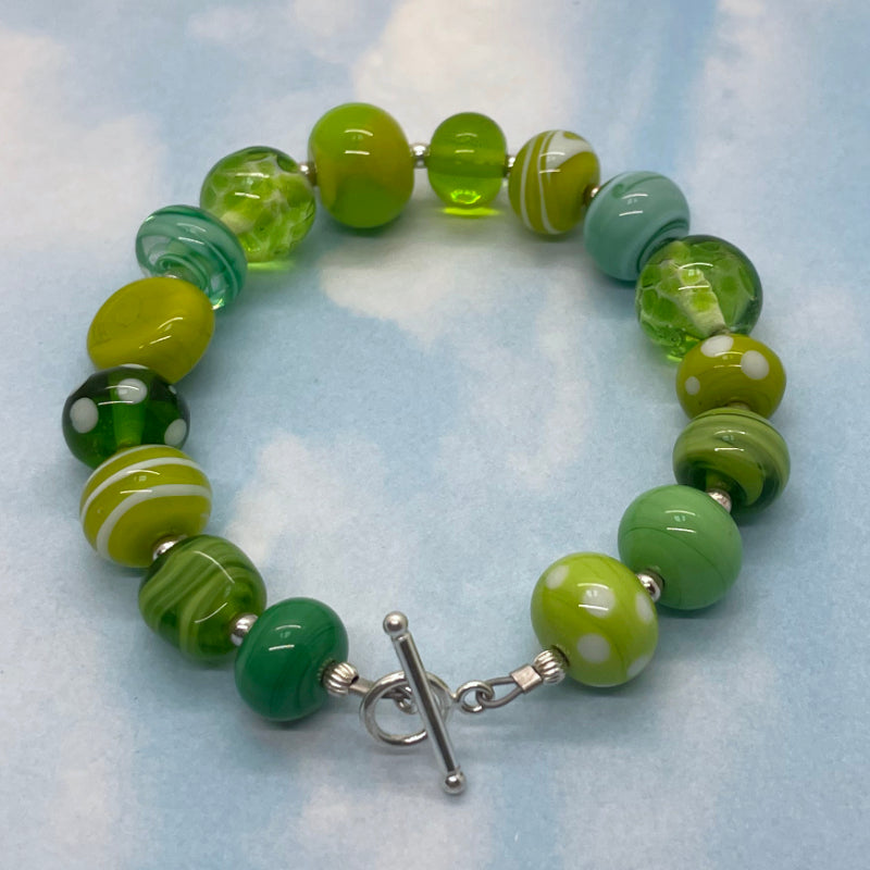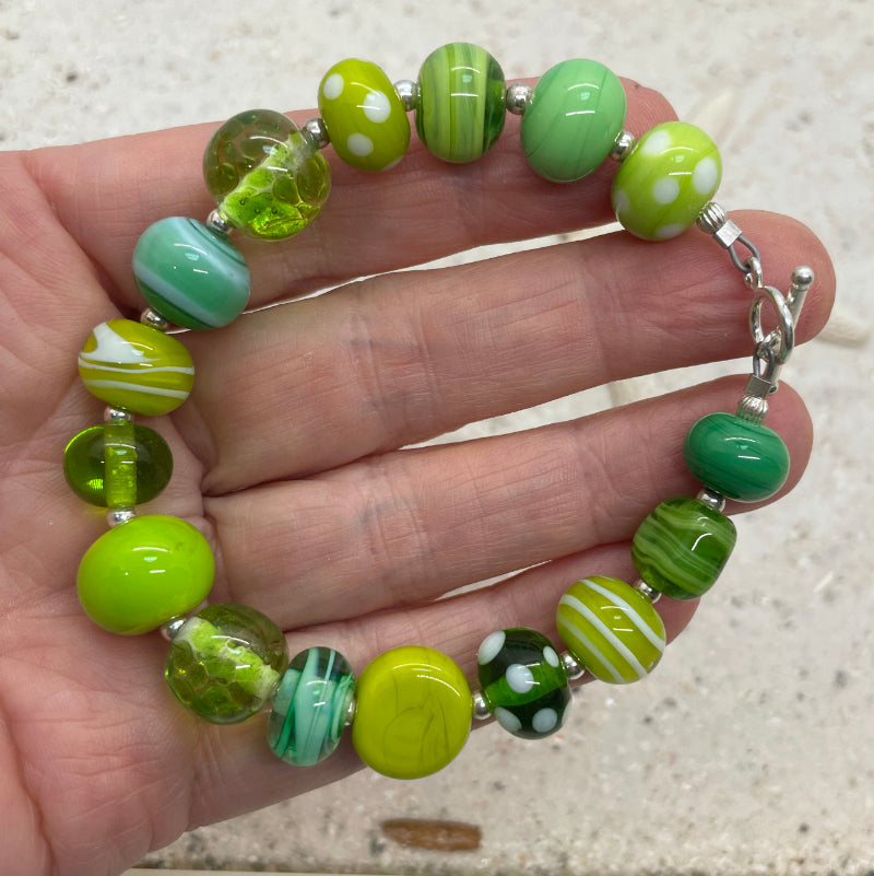 My hands made this moss and meadow bracelet. The lampwork beads are made by me! The beads vary in size from 11mm x 8mm to 13mm x 13mm. They are connected with sterling silver findings and the bracelet is finished with a beautifully elegant sterling silver toggle clasp. The total length of the bracelet is 8" and this fits a medium size wrist.