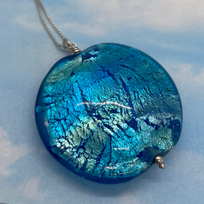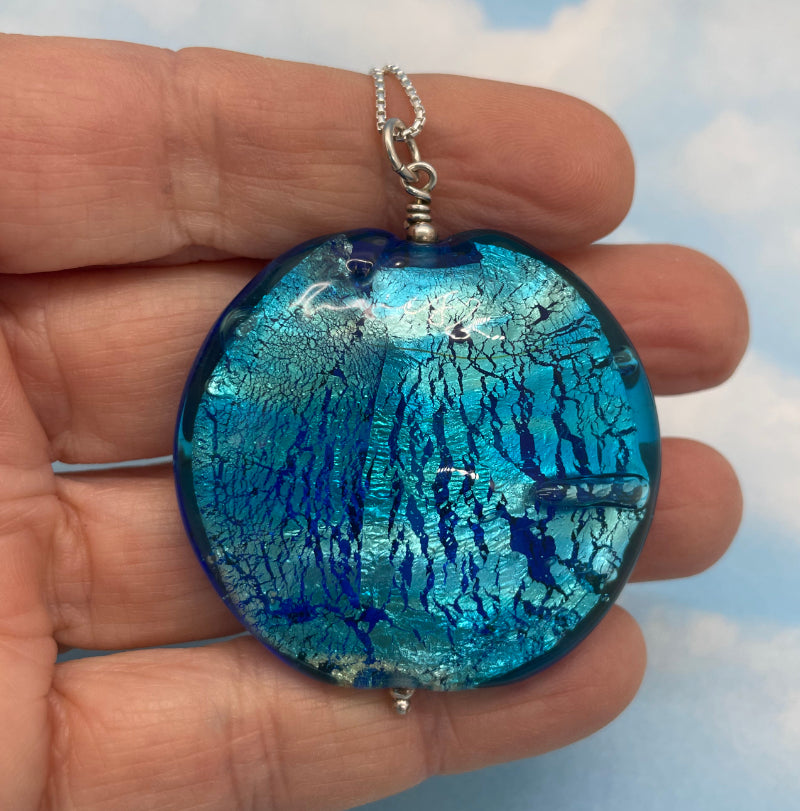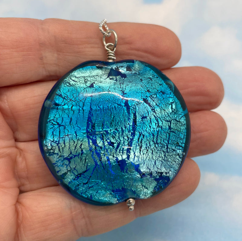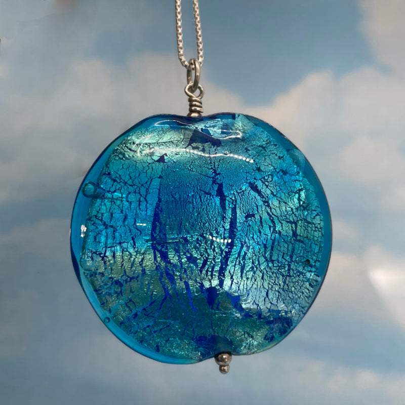 Each bead is individually made by me! There is no paint on any of my beads, just glass upon glass upon glass. Each bead is 4 - 8 layers of glass. Around layer 3 I roll the bead in fine silver leaf, then encase it in more glass. When the bead is large I mash it flat so that the silver disperses. This is what gives my beads the shimmering transparency reminiscent of the ocean in sunshine.