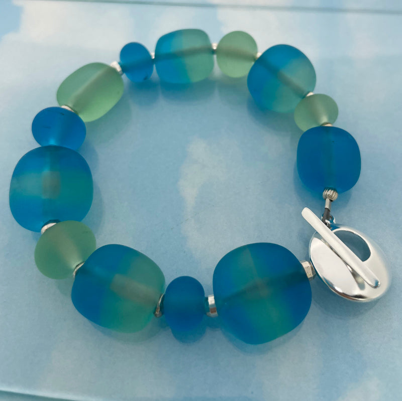 The 7 larger ocean rock beads vary in measurement from approximately 11mm x 11 mm to 15mm x 15mm. The 6 smaller ocean rocks measure approximately 9mm x 12 mm. They are connected with sterling silver findings and the bracelet is finished with a beautifully elegant sterling silver toggle clasp. The total length of the bracelet is 7 3/4" and this fits a small/medium size wrist.