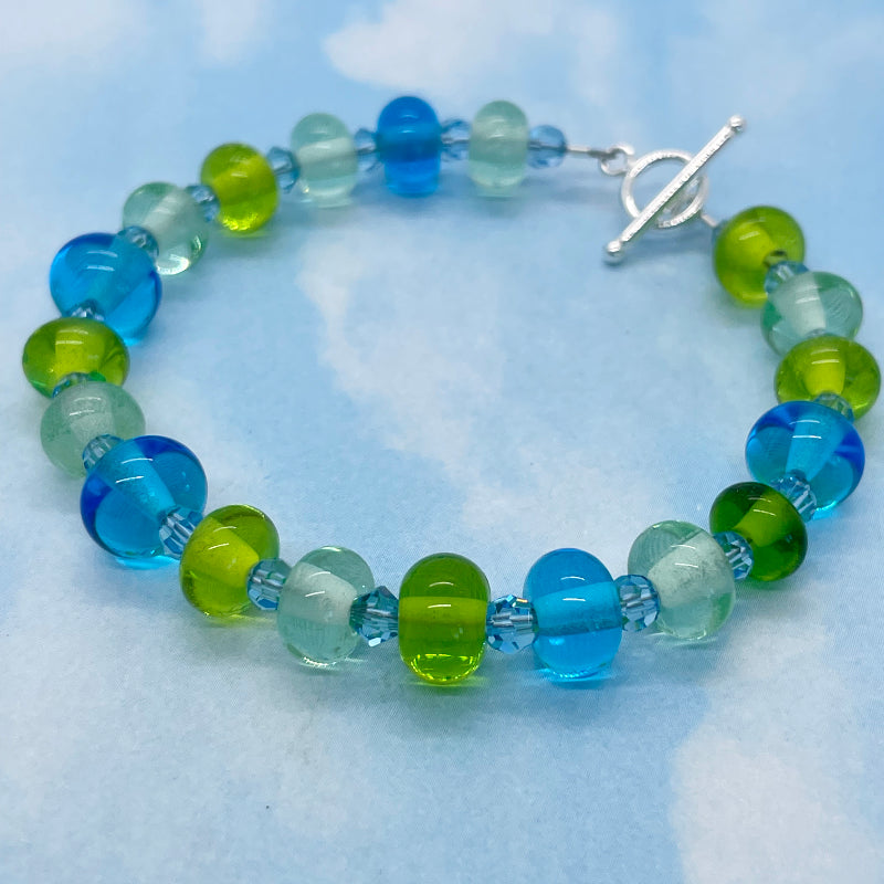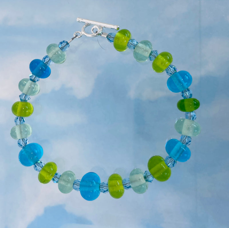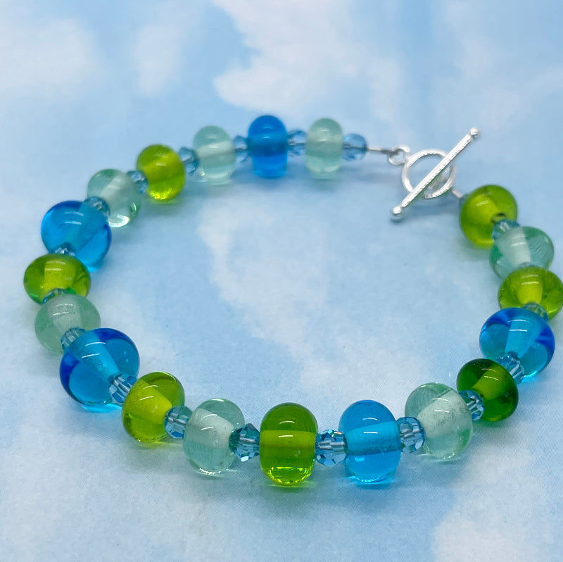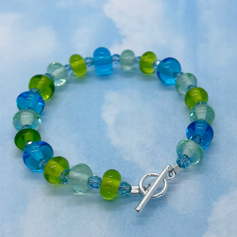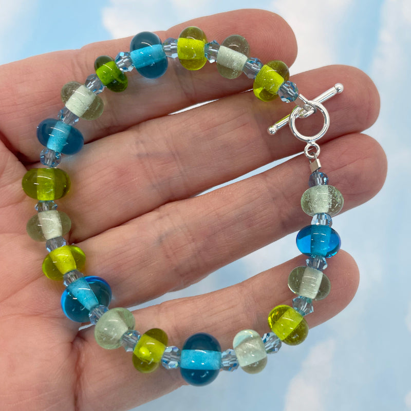 My hands made this tiny bead ocean bracelet. The lampwork beads are made by me! The beads are approximately 7mm x 4mm. They are connected with swarovski crystals and the bracelet is finished with a beautifully elegant sterling silver toggle clasp. The total length of the bracelet is 7 1/2" and this fits a small size wrist.