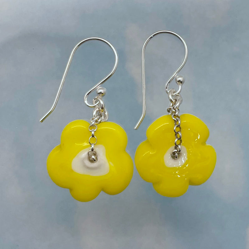 My hands made these daisy earrings. Each handmade bead measures approximately 15 x 15 mm. They hang from sterling silver ear wires, the total length of the earrings are approximately 40 mm.