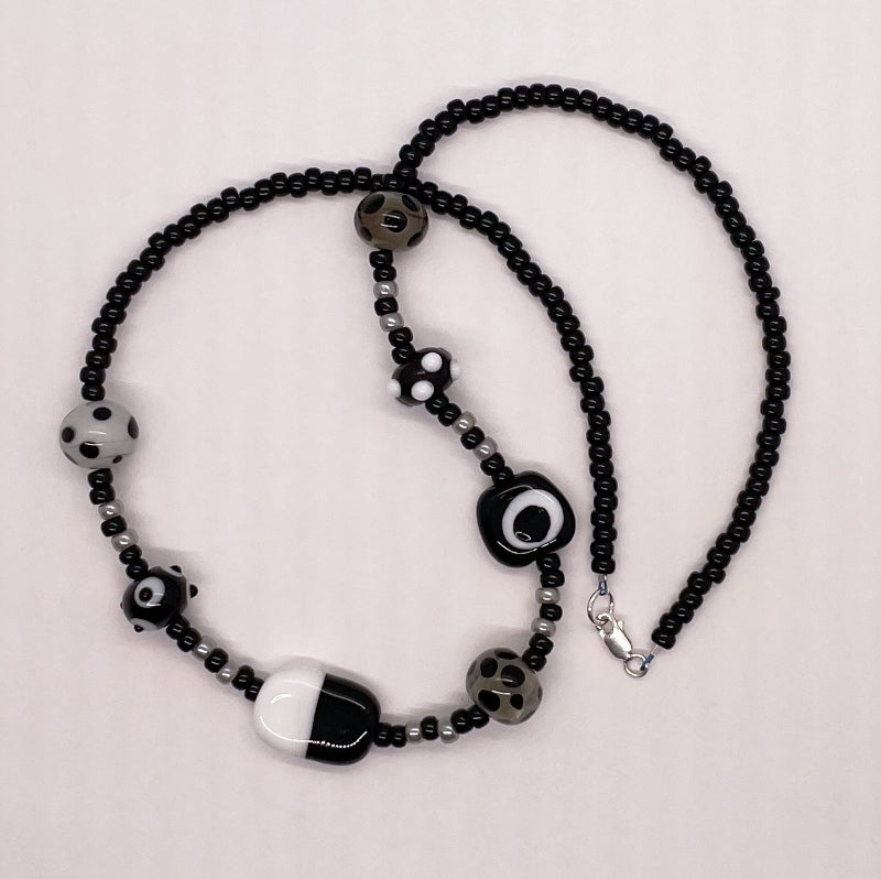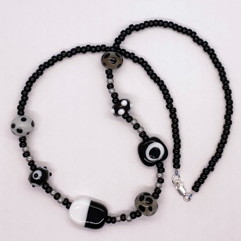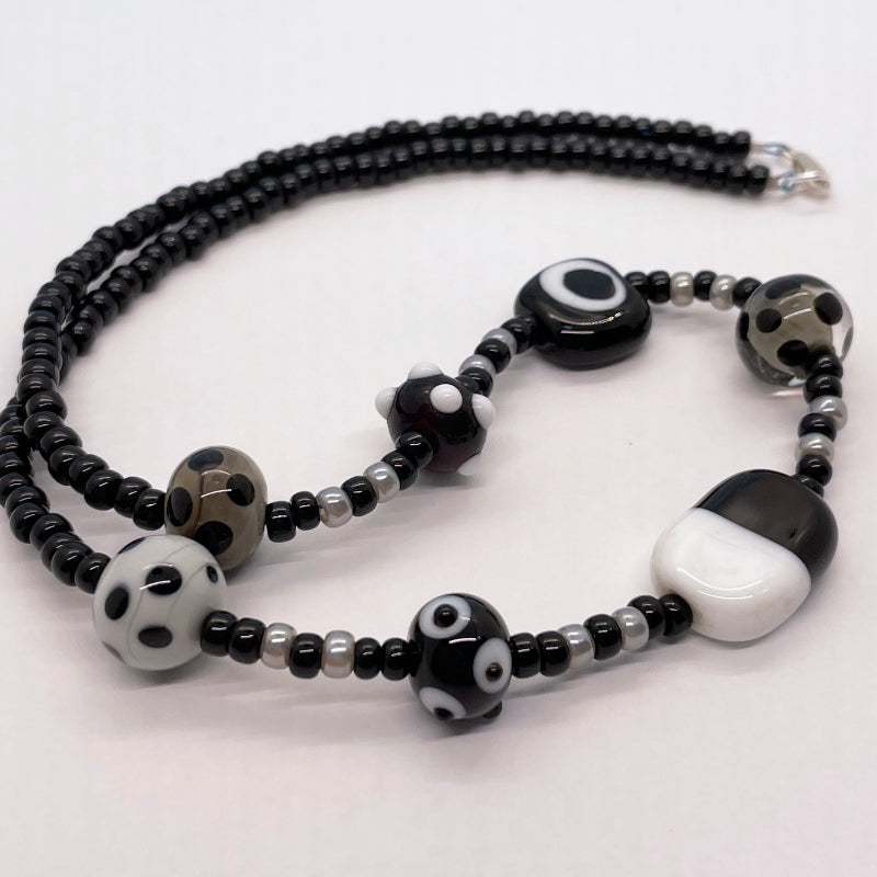 This Fun necklace features 7 of my handmade glass beads in classic black and white colours. They are strung with a selection of the highest quality Japanese seed beads. The necklace closes with a sterling silver lobster claw and measures 21 1/2". Each Fun necklace is a One of a Kind piece.