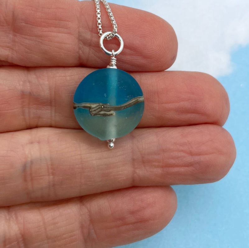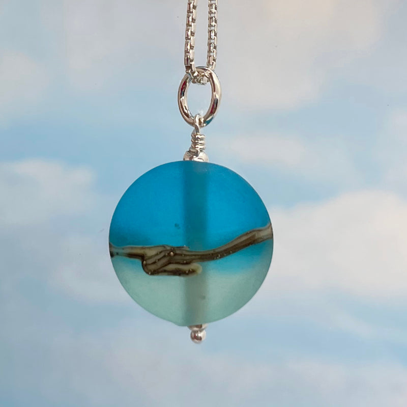 My hands made this pendant. It measures approximately 15 x 15 mm and is lightly etched for a soft glow.