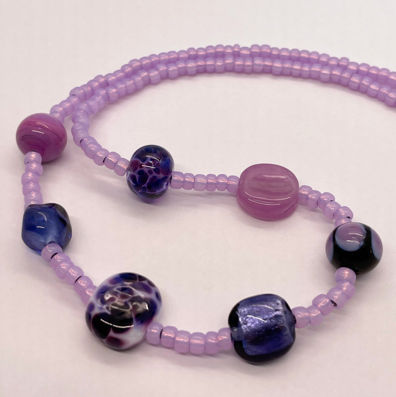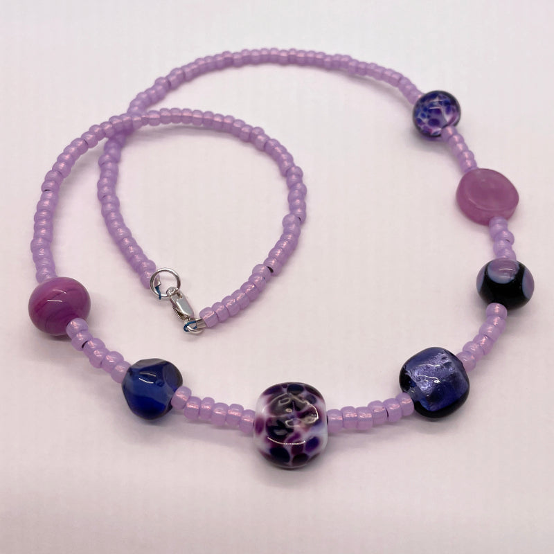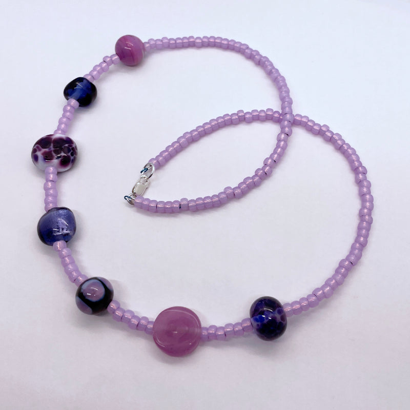 This Fun necklace features 7 of my handmade glass beads in springy colours. They are strung with a selection of the highest quality Japanese seed beads. The necklace closes with a sterling silver lobster claw and measures 21 1/2". Each Fun necklace is a One of a Kind piece.