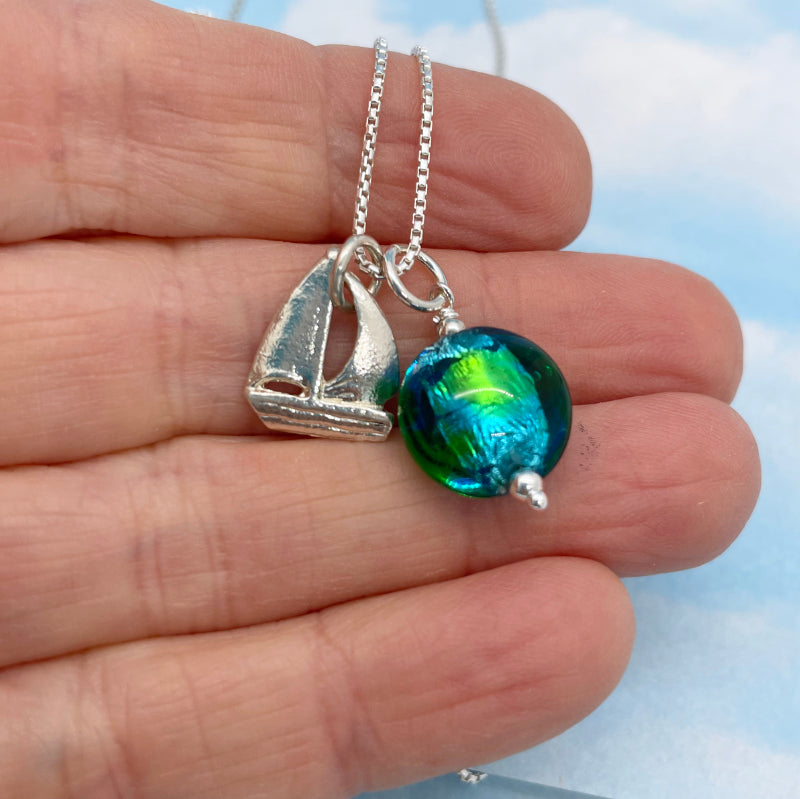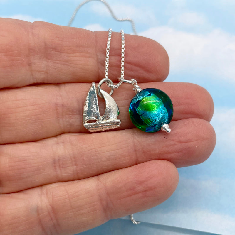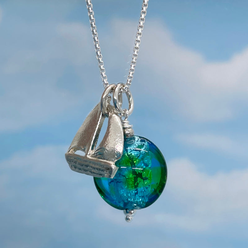 A sterling silver sailboat sails along beside one of my signature ocean beads.