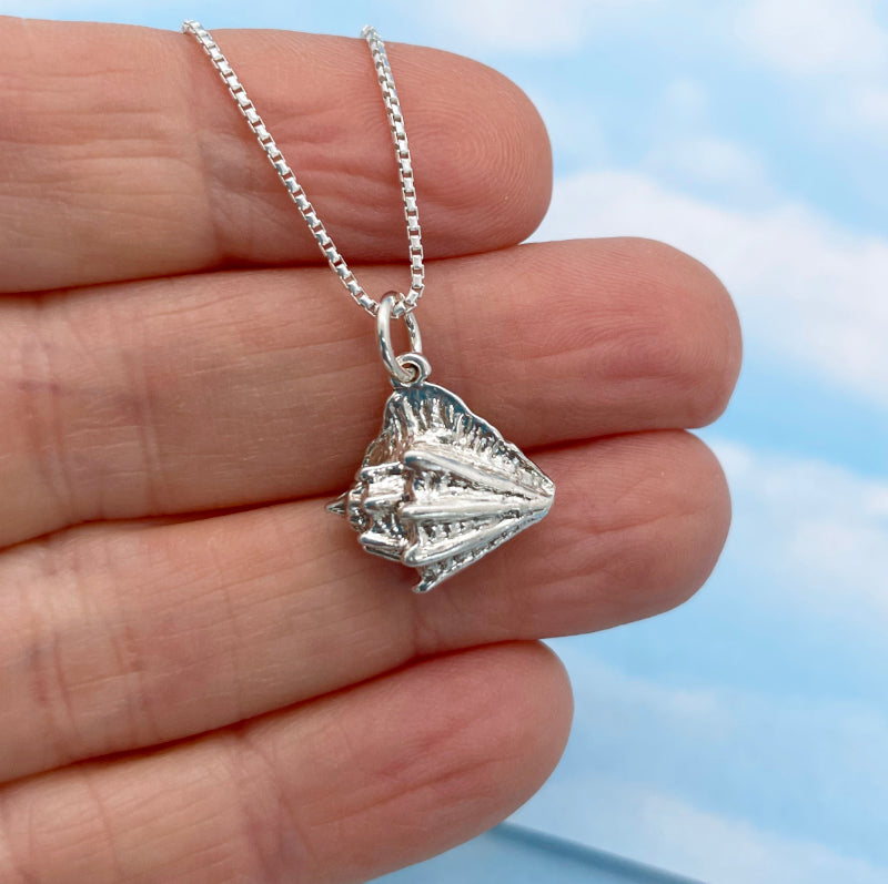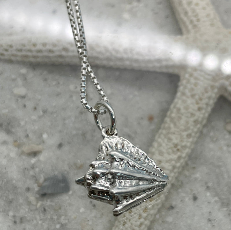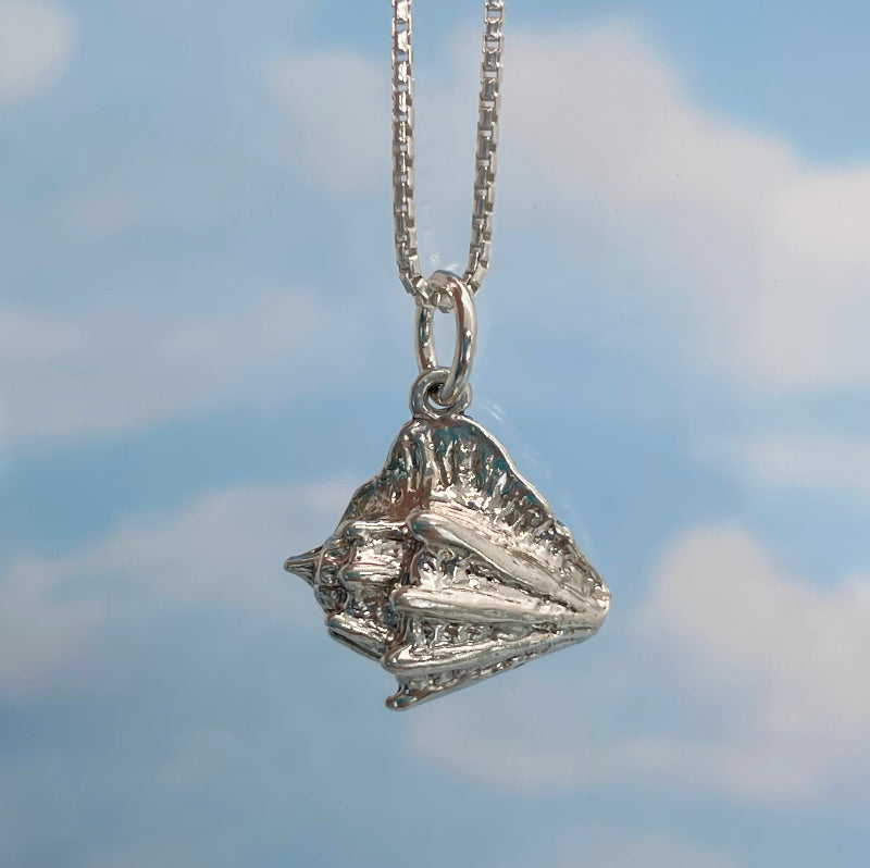 The sterling silver conch charm measures 12 mm x 14 mm and hangs from a 16"-18" sterling silver box chain. If you would like an 18"-20" chain please leave a note when you check out.