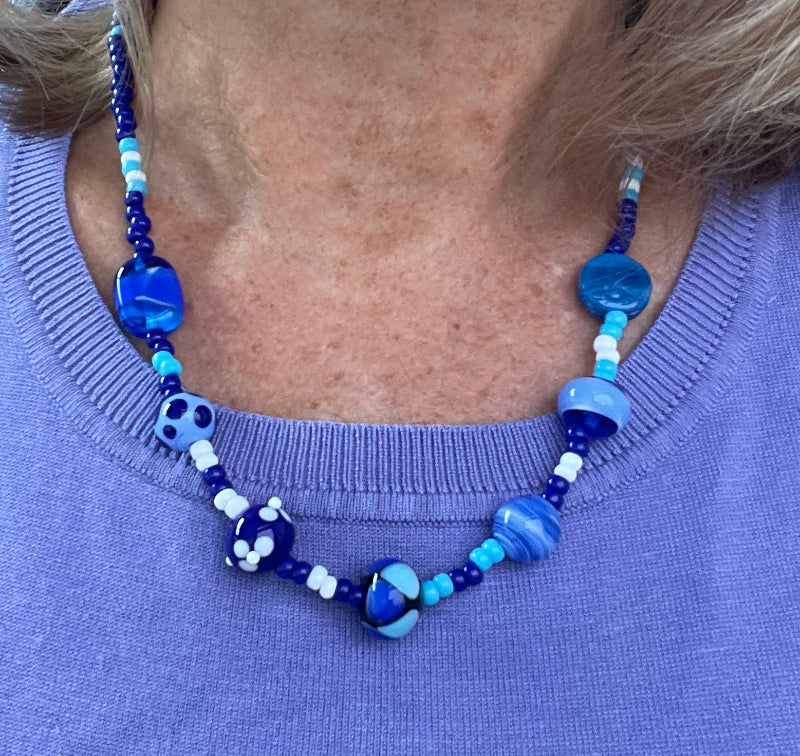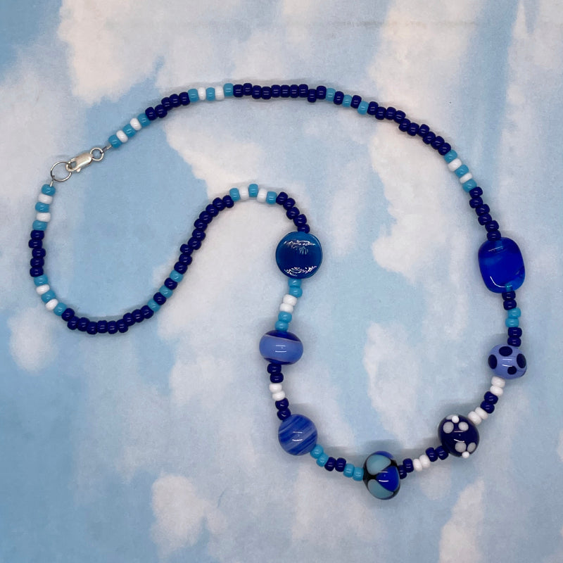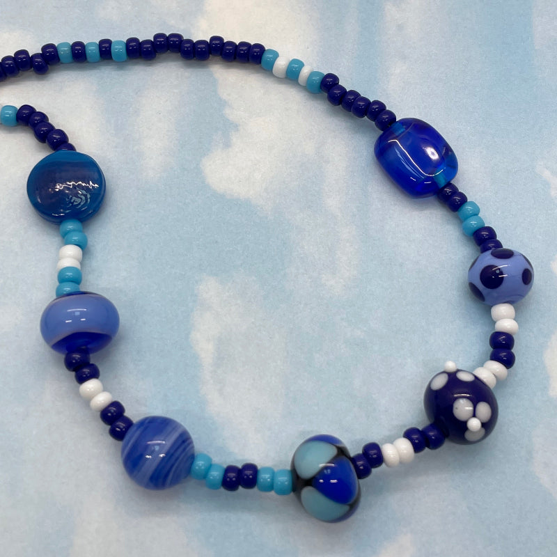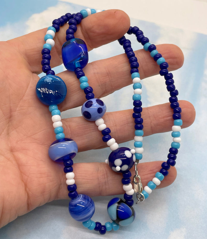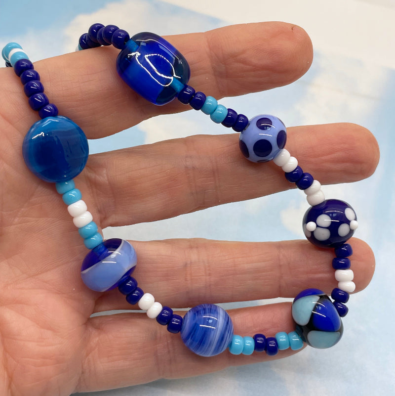 This Fun necklace features 7 of my handmade glass beads in all the blues. They are strung with a selection of the highest quality Japanese seed beads. The necklace closes with a sterling silver lobster claw and measures 19 1/2". Each Fun necklace is a One of a Kind piece.