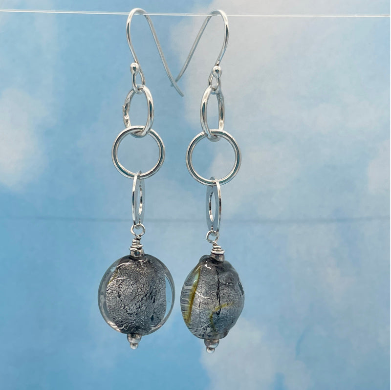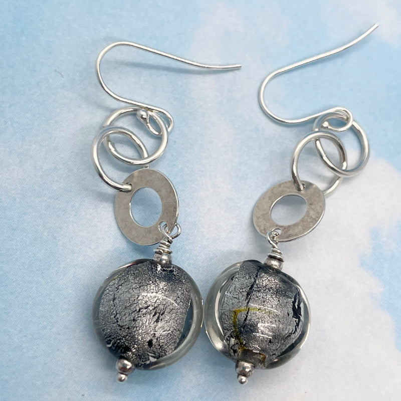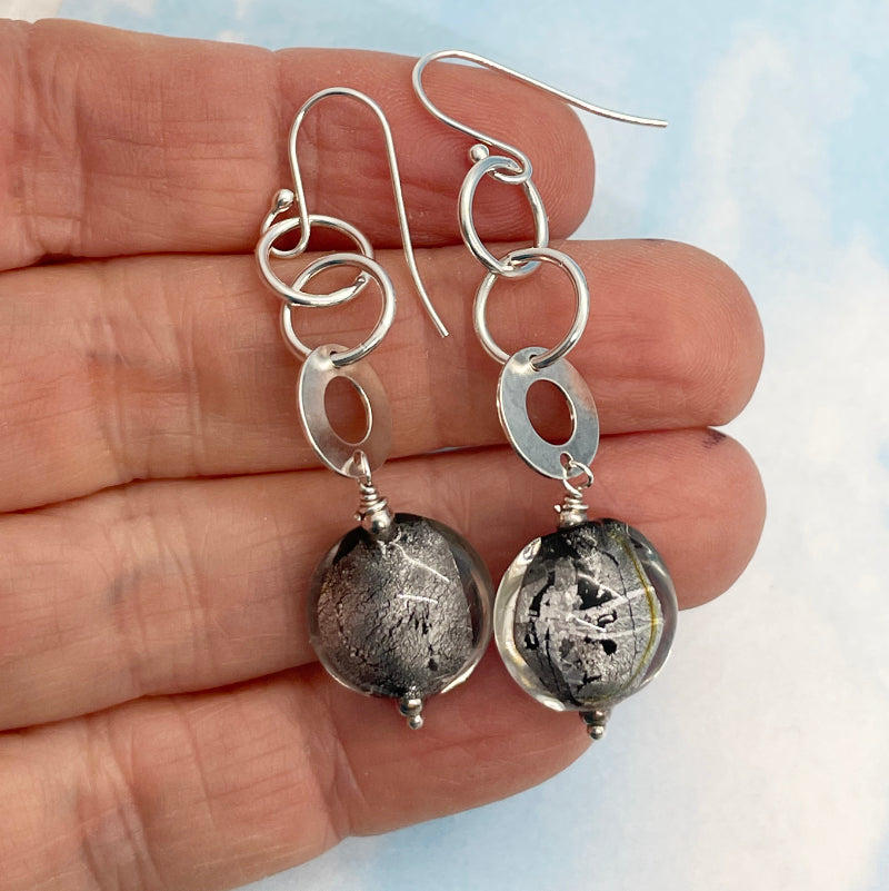Each bead is individually made by me! There is no paint on any of my beads, just glass upon glass upon glass. Each bead is 4 - 8 layers of glass. Around layer 3 I roll the bead in fine silver leaf, then encase it in more glass. When the bead is large I mash it flat so that the silver disperses. This is what gives my beads the shimmering sparkle. This will light up a room and bring you oodles of compliments.