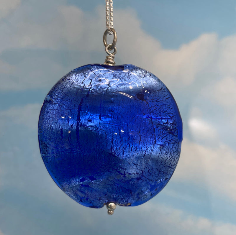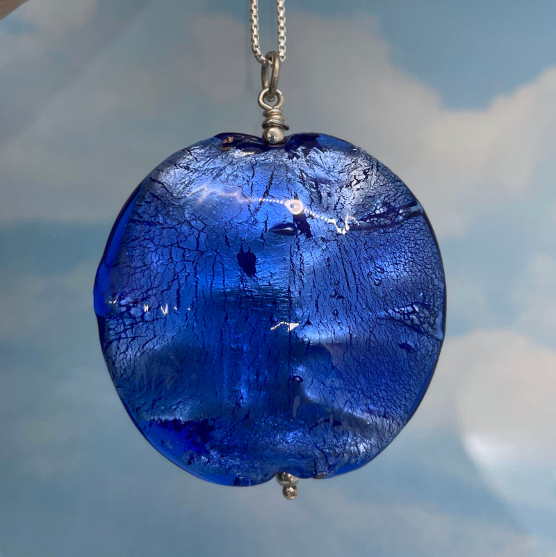 Each bead is individually made by me! There is no paint on any of my beads, just glass upon glass upon glass. Each bead is 4 - 8 layers of glass. Around layer 3 I roll the bead in fine silver leaf, then encase it in more glass. When the bead is large I mash it flat so that the silver disperses. This is what gives my beads the shimmering transparency reminiscent of the ocean in sunshine.